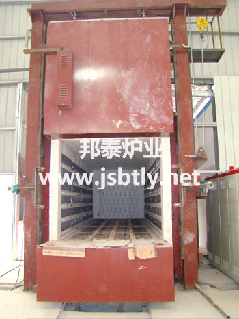 本爐為臺(tái)車式電阻爐,工件加熱時(shí),將臺(tái)車開出爐體外,將工件擺放在臺(tái)車上。