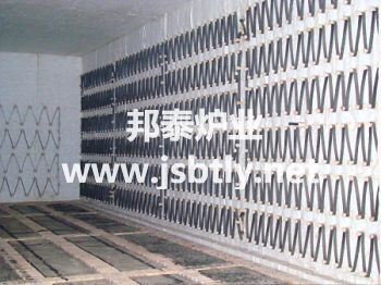 加熱元件采用首鋼產(chǎn)的高電阻合金0Gr25Al5電阻帶布置在爐側(cè)、爐后墻及臺(tái)車上。